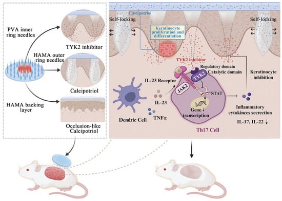 In order to achieve the joint delivery of drugs and exploit the characteristics of dissolving MNs and hydrogel MNs, Wang et al. designed dual-release MNs, Deu@Cal MNs, which loaded deucravacitinib (Deu) in a polyvinyl alcohol (PVA) needle (Figure 6). This design facilitated the dissolution of MNs and the rapid release of Deu after penetration of the skin barrier. Meanwhile, the swelling behavior of methacrylated hyaluronic acid (HAMA) was utilized to enable the sustained release of calcipotriol (Cal) on the surface of psoriatic skin. In vivo efficacy demonstrated that, compared to Deu@MNs and Cal@MNs, the epidermal structure of mice was restored to the closest normal level after treatment with Deu@Cal MNs. Additionally, the expression levels of cytokines, such as TNF-α and IL-17, were significantly reduced [137].