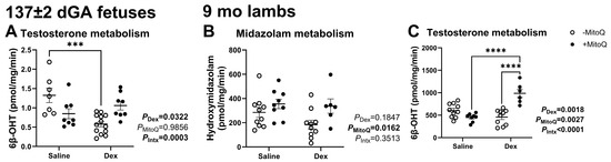 Consistent with our previous work, CYP3A metabolism of midazolam to hydroxymidazolam was not measurable in hepatic microsomes from 137 ± 2 dGA fetuses (42). However, CYP3A-mediated metabolism of testosterone to 6β-hydroxytestosterone (6β-OHT) was detectable in the fetus, and activity was significantly reduced by maternal Dex (PDex = 0.0322; Figure 1A), but only in the absence of MitoQ (Pintx = 0.0003; Figure 1A). In 9 mo lambs exposed to MitoQ in utero, hepatic CYP3A metabolism of midazolam was increased (PMitoQ = 0.0162; Figure 1B). CYP3A metabolism of testosterone to 6β-OHT was increased due to MitoQ (PMitoQ = 0.0027) and Dex (PDex = 0.0018), but significance was driven by combined treatment (PIntx < 0.0001; Figure 1C).