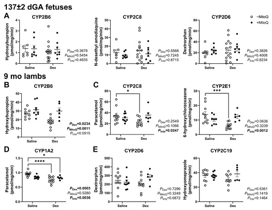 Antenatal treatments did not alter hepatic CYP2B6, CYP2C8 or CYP2D6 activity in the 137 ± 2 dGA fetus (Figure 2A). Activity in CYP1A2, CYP2E1 and CYP2C19 was not detectable at this gestational age (43). CYP2B6 activity in 9 mo lambs was decreased by Dex treatment (PDex = 0.0234) and normalised by maternal MitoQ treatment (PMitoQ = 0.0011; Figure 2B). Post hoc analysis showed that CYP2C8 and CYP2E1 activity was decreased in lambs exposed to Dex only (PIntx = 0.0247 and 0.0012 respectively; Figure 2C), while CYP1A2 activity was decreased by Dex exposure both with and without MitoQ (PDex = 0.0003; Figure 2D). CYP2D6 and CYP2C19 were not impacted in 9 mo lambs (Figure 2E).