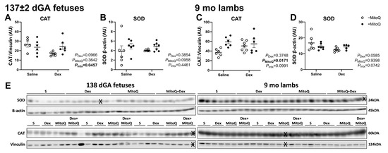 Fetal catalase (CAT) and superoxide dismutase (SOD) protein expression were not impacted by Dex or MitoQ (Figure 3A,B). CAT protein was increased in MitoQ-exposed lambs at 9 mo (PMitoQ = 0.0171; Figure 3C). SOD was not altered by any antenatal treatments in 9 mo lambs (Figure 3D).