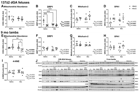 Markers of mitochondrial function and abundance are impacted by antenatal treatments in fetal and young adult offspring. (A,E) Mitochondrial abundance as represented by a ratio of mitochondrial-derived COX-I to nuclear-derived SDH-A, (B,F) dynamin-related protein 1 (DRP1), (C,G) mitofusion-2, (D,H) mitochondrial dynamin-like GTPase (OPA1) and (I) 4-hydroxynonenal (4HNE). Protein normalised to β-actin or Vinculin. Each data point represents an individual animal. An ‘X’ is superimposed over excluded lanes (J). * p < 0.05, ** p < 0.01, *** p < 0.001.