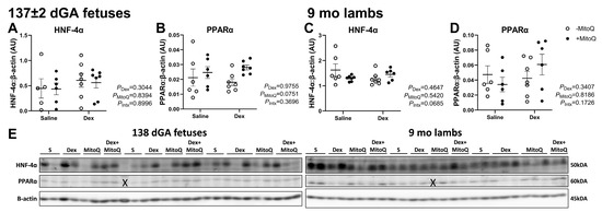 The protein expression of both HNF-4α and PPARα was not altered by antenatal treatment in fetuses (Figure 5A,B) or 9 mo lambs (Figure 5C,D).