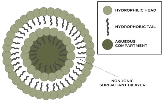 Due to their structure, niosomes can load both hydrophilic and lipophilic active compounds in the interior aqueous compartment and outer lipid layer, respectively []. The most often utilised non-ionic surfactant classes for niosome production (alkyl ethers, alkyl esters, alkyl amides and fatty acid esters, polymeric surfactants) are presented in Table 1.