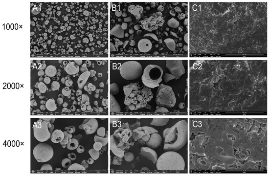 SEM results of polysaccharide–iron complexes ((A1–A3): PIC powders; (B1–B3): test sample B, powders in capsule, 150 mg; (C1–C2): inner coating of test sample A; (C3): outer coating of test sample A).