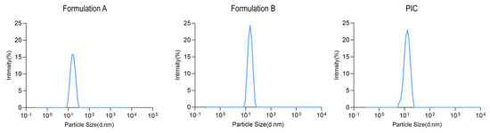 The particle size distribution diagrams of PICs in Formulation A, PICs in Formulation B, and the raw material (PICs).