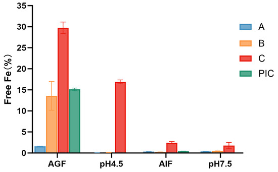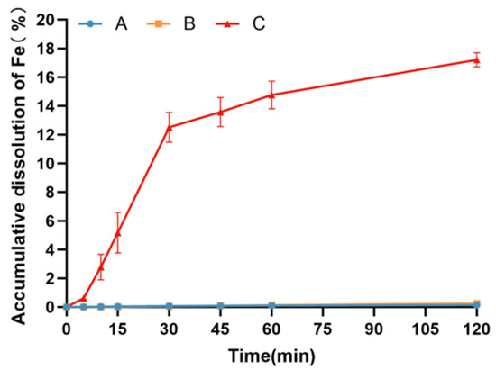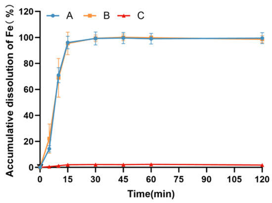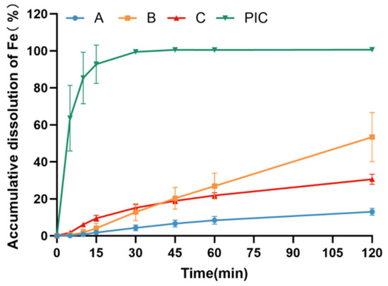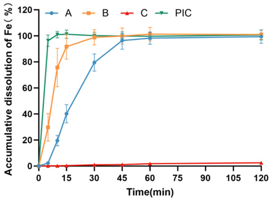 The findings depicted in Figure 3 reveal substantial disparities in the dissolution behavior of various iron preparation samples in artificial gastric fluid. Notably, the dissolution rate of test sample A is relatively sluggish, with the cumulative dissolution rate at 2 h being less than 15%. Conversely, the dissolution rate of the polysaccharide–iron complex resembling test sample B is comparatively rapid, achieving an iron dissolution rate exceeding 50% within 2 h. This discrepancy could be attributed to the favorable solubility of PICs in artificial gastric fluid, facilitating their rapid dissolution.