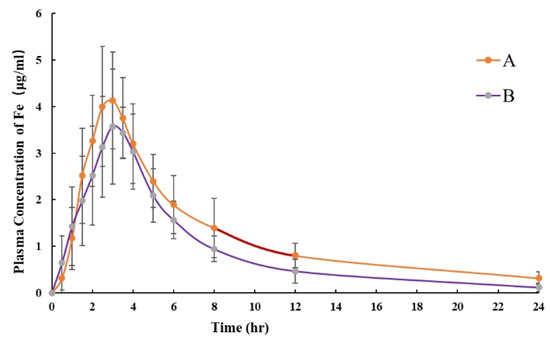 Prior to the experiments, eight IDA female beagle dogs (10–12 kg) were fasted for 8 h and divided into two groups (n = 4 per group): Group 1 received the first type of polysaccharide–iron complex capsule (test sample A, Niferex capsule, 150 mg), and Group 2 received the second type of polysaccharide–iron complex capsule (test sample B, powders in capsule, 150 mg). The pharmacokinetic profiles of test sample A and test sample B in the dogs were evaluated in a randomized, single dose, 2 × 2 crossover study with a 2-week washout period. After the IDA dogs were orally administered test sample A (one capsule) or test sample B (one capsule), blood samples were collected at 0.5, 1,1.5, 2, 2.5, 3, 3.5, 4, 5, 6, 8, 12, and 24 h. Blood samples were centrifuged at 12,000 rpm for 10 min, and the obtained plasma samples were kept frozen at −80 °C until analyzed by inductively coupled plasma mass spectrometry (ICP MS7900, California, USA, Agilent Corp).
