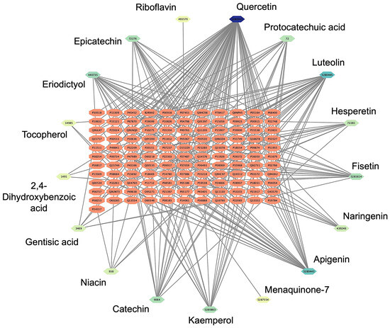 The network pharmacology analysis aimed to identify potential drug–target interactions and determine the most suitable target receptor for the bioactive compounds derived from Bombyx mori. A comprehensive literature review yielded 53 chemical compounds from Bombyx mori, which were initially filtered based on their pharmacological properties, specifically selecting compounds with an OB of ≥30% and a DL score of ≥0.18. Following this screening procedure, 17 chemical compounds were shortlisted for further investigation. To explore the possible interactions between these compounds and their target receptors, we employed the SEA platform, which enables the prediction of target proteins based on the chemical structure of each compound. After inputting the SMILES representations of the selected compounds into the SEA platform, we performed network analysis to generate a compound-target network. The resulting Bombyx mori component-target network consisted of 122 nodes and 935 edges. The nodes were categorized into two types: target proteins and bioactive compounds. The target proteins, shown as orange nodes, represented potential biological targets that could interact with the compounds. On the other hand, the chemical compounds derived from Bombyx mori were depicted as nodes with a green-to-blue gradient to illustrate their level of interaction. The darker the color, the greater their interaction with the target protein. This color gradient effectively visualizes the varying strengths of the compound–protein interactions, with darker shades representing a higher degree of interaction. Among the compounds analyzed, quercetin (PubChem CID: 5280343), luteolin (PubChem CID: 5280445), and apigenin (PubChem CID: 5280443) emerged as the top compounds. Each was associated with a high number of target proteins, suggesting their potential as key bioactive molecules for further exploration (Figure 1).