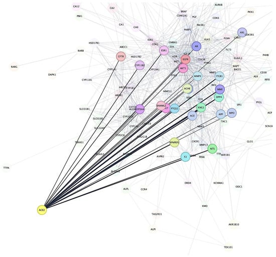 Results of the network pharmacology analysis. ACE2 is identified as the most prominent target receptor, showing extensive interactions with proteins targeted by the Bombyx mori-derived chemical compounds.