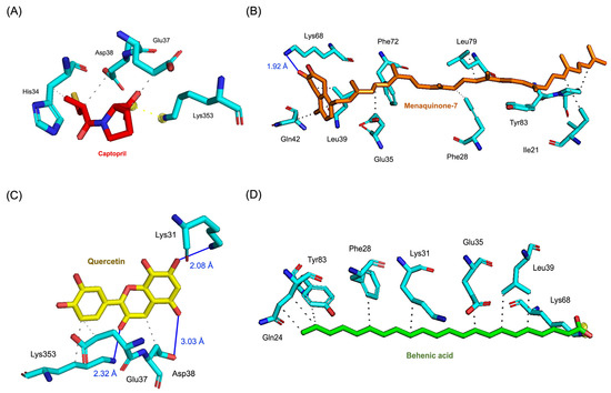 Results of molecular docking simulations. 2D interaction maps of the ACE2 receptor with the top three performing compounds derived from Bombyx mori, compared to the standard inhibitor captopril. (A) Captopril_ACE2 complex. (B) Menaquinone-7_ACE2 complex. (C) Quercetin_ACE2 complex. (D) Behenic acid_ACE2 complex.