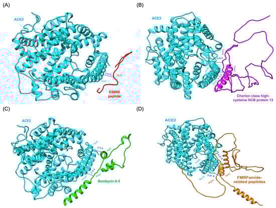 Results of molecular docking simulation. 3D binding poses of protein-based compounds derived from Bombyx mori interacting with the ACE2 receptor within the binding pocket. (A) DX600 peptide_ACE2 complex (standard inhibitor). (B) Chorion class high-cysteine HCB protein 13_ACE2 complex. (C) Bombyxin A-5_ACE2 complex. (D) FMRFamide-related peptides_ACE2 complex.