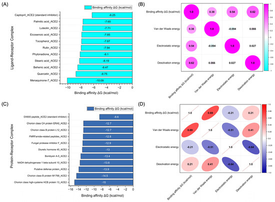 Results of molecular docking simulations. (A) Binding affinity values (kcal/mol) of the top 10 chemical compounds derived from Bombyx mori docked to the active sites of ACE2. (B) Correlation matrix depicting the relationship between binding energy (kcal/mol) and individual energy components for the chemical compounds derived from Bombyx mori. (C) Binding affinity values (kcal/mol) of the top 10 protein-based compounds derived from Bombyx mori docked to the active sites of ACE2. (D) Correlation matrix illustrating the relationship between binding energy (kcal/mol) and individual energy components for the protein-based compounds derived from Bombyx mori. The correlation values span from −1 to 1, with 1 representing a perfect positive correlation, −1 indicating a perfect negative correlation, and 0 signifying the absence of any correlation.