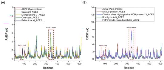 RMSF Profiles of ACE2-Ligand complexes. (A) RMSF profiles of chemical compounds derived from Bombyx mori (Menaquinone-7, Quercetin, and Behenic acid) compared to the standard inhibitor, Captopril, highlighting the fluctuations in key binding regions of ACE2. (B) RMSF profiles of protein-based compounds derived from Bombyx mori (Chorion class high-cysteine HCB protein 13, Bombyxin A-5, and FMRFamide-related peptides) compared to the standard protein inhibitor, DX600 peptide, showing similar fluctuations and disruption of hydrogen bonds in critical binding regions of ACE2.