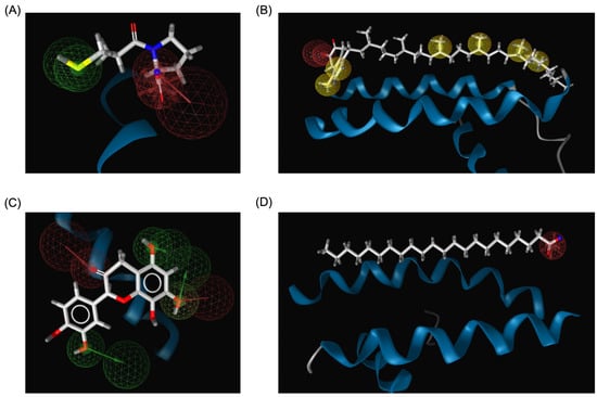 3D structure-based pharmacophore modeling results. (A) Pharmacophore model of the Captopril_ACE2 complex. (B) Pharmacophore model of the Menaquinone-7_ACE2 complex. (C) Pharmacophore model of the Quercetin_ACE2 complex. (D) Pharmacophore model of the Behenic acid_ACE2 complex. Hydrophobic interactions are depicted as yellow spheres, while hydrogen bond donors and hydrogen bond acceptors are represented by green and red arrows, respectively.