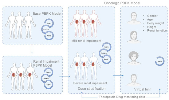 Model-informed precision dosing (MIPD) aims to improve pharmacotherapy outcomes through individualized treatment based on the patient’s characteristics [14]. In this context, physiologically based pharmacokinetic modeling and simulation (PBPK M&S) is a valuable tool for optimizing dose regimens in stratified populations, incorporating specific population characteristics. Recently, the digital twins approach using PBPK M&S has shown promise for dose individualization, using patient individual characteristics as input data, such as demographics, genetics, liver and kidney functions [15,16].