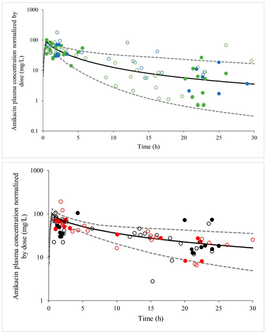 Amikacin plasma concentration versus time profiles were extracted using the web-based data extraction tool WebPlot Digitizer (https://automeris.io/WebPlotDigitizer/) (accessed on 12 August 2024) and used for model validation. Initially, the PBPK model was verified and validated based on the design of clinical trials previously published for healthy volunteers, followed by evaluation in critically ill non-cancer patients with varying stages of renal dysfunction (Table S2) [6,18,19,20,21]. The PBPK model verification was performed using visual predictive checks, and the ratios of observed to predicted pharmacokinetic parameters AUC, Cmax, CL, and Vd within a 2-fold error range (0.5 ≤ ratio ≤ 2) were considered adequate.