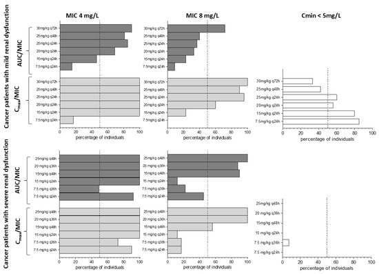 Dosage regimens were proposed for cancer patients stratified according to renal function and evaluated as PK/PD targets for amikacin efficacy and safety (Figure 4). For mild and severe renal impairment in cancer patients, the dosage regimens simulated had higher efficacy rates when evaluating the Cmax value than the AUC value as the PK parameter in the PK/PD index (Figure 4).