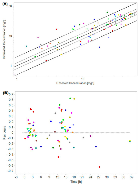 Forty individual digital twins were built in PK-Sim® employing the matching data regarding sex, age, weight, and height of the patients. The renal dysfunction model was selected for each patient depending on the CLcr calculated by the Cockroft–Gault formula and considering the cutoff point of 60 mL/min. Each subject was simulated to match the amikacin dosing regimen of their respective twin. Plasma concentration versus time profile was compared with the individual patient’s data to verify the applicability of the developed model in individualizing the amikacin dosage regimen. The overall performance of the PBPK model was evaluated using a goodness-of-fit plot for the predicted versus observed plasma concentrations and magnitude of amikacin concentrations residual error versus time plot. The residuals were calculated using the following formula: