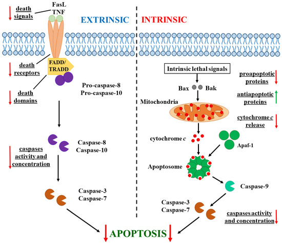 There are two main pathways of apoptosis—extrinsic and intrinsic. These begin after different apoptotic-induced signals and involve different caspase proteolytic enzymes (Figure 1) [25]. Apoptosis in cancer cells has specific differences. In some cancer cells, the expression of death receptors (such as TNFR1 and FasR) and the Fas-associated death domain (FADD) is deregulated [26]. The concentration of external death signals such as tumor necrosis factor (TNF) and Fas ligand (FasL) can also be reduced [27]. The concentration and activity of the major enzymes involved in both pathway caspases decreased in tumor cells [28]. Additionally, the equilibrium between anti-apoptotic (Bcl-2 for instance) and proapoptotic (Bax and Bak) proteins is disturbed in cancer cells: the concentration of proapoptotic ones is reduced, while the expression of anti-apoptotic proteins is increased [29]. Moreover, the expression of inhibitors of apoptosis proteins (IAPs) is upregulated and their level is increased [30]. Additionally, the release of cytochrome c from the mitochondria, which activates the caspase cascade after the formation of cytC-Apaf-1 complex with the cytoplasmic protein apoptotic protease-activating factor (Apaf-1), is blocked in cancer cells because of the hyperpolarization of the internal mitochondrial membrane [31].
