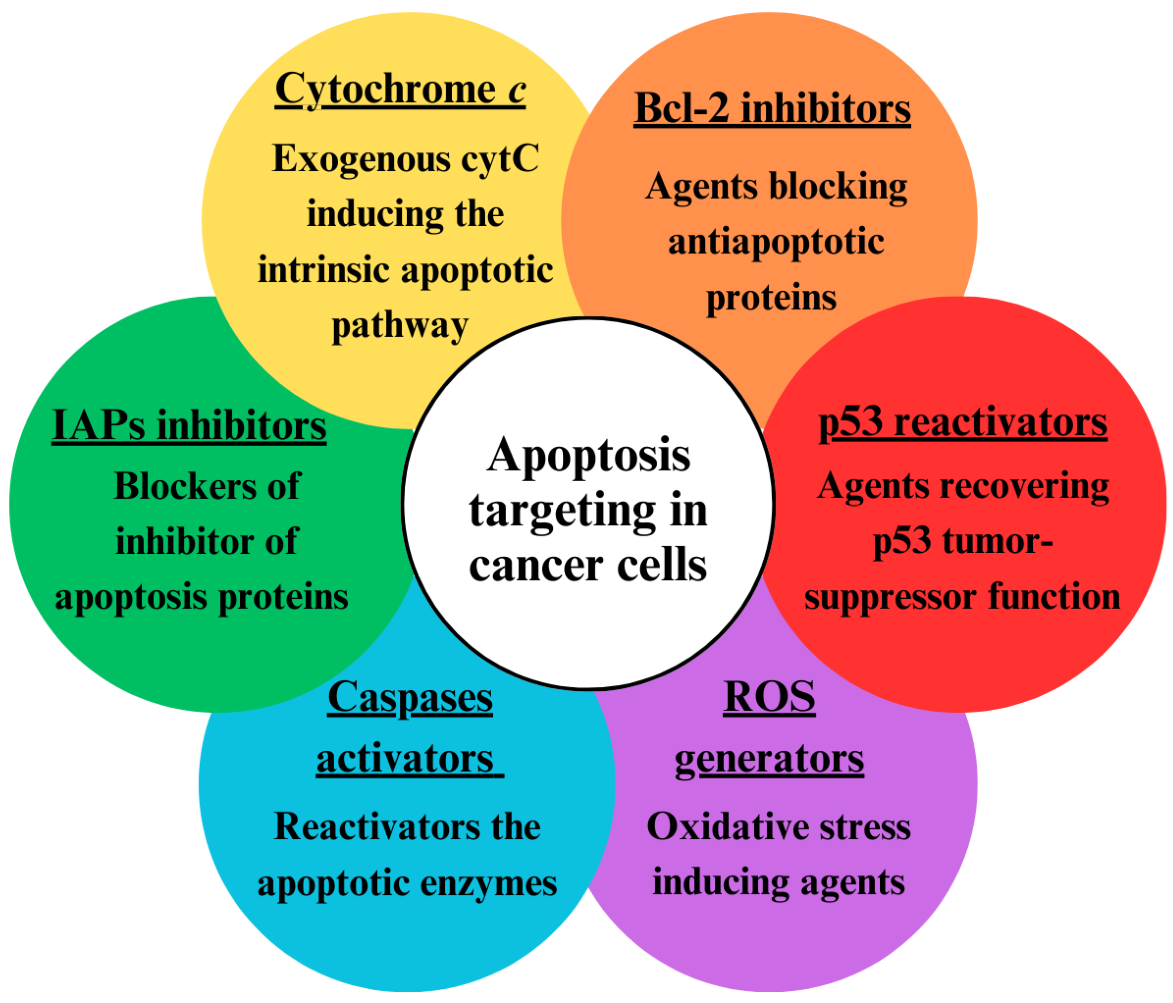 Since both intrinsic and extrinsic apoptotic pathways are suppressed in cancer cells, different approaches have been developed to activate apoptosis (Figure 2) [35]. One approach is based on restoring the disturbed balance between proapoptotic and anti-apoptotic proteins [36]. This can be achieved with the use of agents that block Bcl-2 proteins such as sodium butyrate, etc. Another way to enhance apoptosis in cancer cells is via activators of caspases (apoptin, for instance) [37]. The recovery of the tumor suppressor p53 via gene therapy is also a possible approach [38]. Additionally, the apoptosis threshold can be lowered by blockers of inhibitors of apoptosis proteins (IAPs), which can block either the X-linked inhibitor of apoptosis protein (XIAP) or survivin [39]. Agents that generate reactive oxygen species (ROS), such as hydrogen peroxide, singlet oxygen, superoxide anions, and hydroxyl radicals, can induce oxygen stress in cancer cells and lead to apoptosis [40]. Such a ROS generator is α-tocopheryl succinate [41]. The introduction of exogenous cytC is also a promising approach for targeting apoptosis in cancer cells [42].