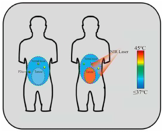 PTT performs photothermal conversion via PTAs, which converts light energy into heat, raising the TME temperature to 41–47 °C or higher. Adapted from [10], Institute of Electrical and Electronics Engineers, 2023.