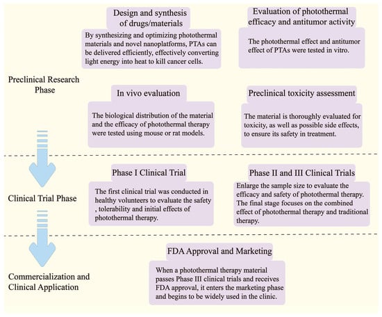 The development and application of PTT require several stages, including preclinical research, animal model testing, clinical trials, and clinical application, each with its own challenges (Figure 3). Issues such as the biocompatibility and toxicity of materials, photothermal efficiency and selectivity, drug delivery efficiency, and side effect management must be addressed one by one to progress to clinical application. For example, Zhu, H., et al. significantly improved biocompatibility through the surface modification of gold NPs [49]; Li, Y., et al. developed polymer nanoparticles that can target tumors and enhance photothermal effects, improving the selectivity and therapeutic effects of PTT [50]; in clinical trials, Chen, Q., et al. effectively improved treatment outcomes by combining immunotherapy [51]. Overall, by optimizing material design, enhancing biocompatibility, improving targeting, and integrating with other treatment modalities, it is possible to overcome bottlenecks throughout the process and facilitate the transition of PTT to clinical application and market promotion.