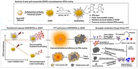 PTT combined with chemotherapy can exert a synergistic anti-tumor effect. Yao et al. designed graphene quantum dot-capped mesoporous silica NPs for combining PTT with controlled drug delivery, achieving significant tumor growth inhibition in vivo [55]. Xue et al. developed PBNPs encapsulated with a gel-adriamycin conjugate, where the drug release was activated by gelatinase, an endogenous proteolytic enzyme that is highly expressed in tumor tissues. In vitro experiments on Huh7 tumor cells demonstrated that the material exhibited strong photothermal effects and showed a synergistic therapeutic effect when combining PTT and chemotherapy [34]. Liu et al. prepared a nano-MoS2 by the hydrothermal method, which had good photothermal conversion performance, a high DOX loading rate, and pH-sensitive drug-controlled release ability. The inhibition rate of MoS2-DOX nanocomposites loaded with DOX on HuH-7 cells was as high as 92.09% under near-infrared irradiation, which was considerably more effective than PTT or chemotherapy individually [56]. Gong et al. grafted thyrocalcitonin (TCA) and folic acid (FA) onto Fe3O4-modified graphene oxide (MGO) to prepare a new hybrid nanomaterial MGO-TCA-FA and successfully loaded DOX onto MgO-TCA-FA. In vitro and in vivo experiments showed that the nano-drug carrier could specifically target liver cancer cells and had a significant killing effect, and that the tumor inhibition rate of PTT combined with chemotherapy was about 85%, which was significantly higher than that of single therapy [57]. Nam et al. developed gold nanorods conjugated with CpG oligonucleotides, demonstrating enhanced dendritic cell activation and anti-tumor immunity when combined with PTT (Figure 4) [11]. Chen et al. designed a nanoplatform by coating mesoporous polydopamine (mPDA) on gold nanorods and loading DOX into the Au@mPDA system. This platform exhibited a high drug loading capacity, efficient photothermal conversion, and a dual-responsive drug release triggered by both pH and photothermal effects. In vivo studies revealed that the Au@mPDA@DOX system notably improved anti-tumor outcomes in breast cancer compared to chemotherapy or PTT alone [58].