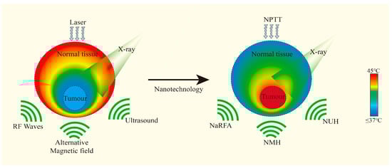 Different types of nanoparticles accumulate in the tumor and absorb various external energies, enhancing the effect of hyperthermia. Adapted with permission from [12], Elsevier, 2016.