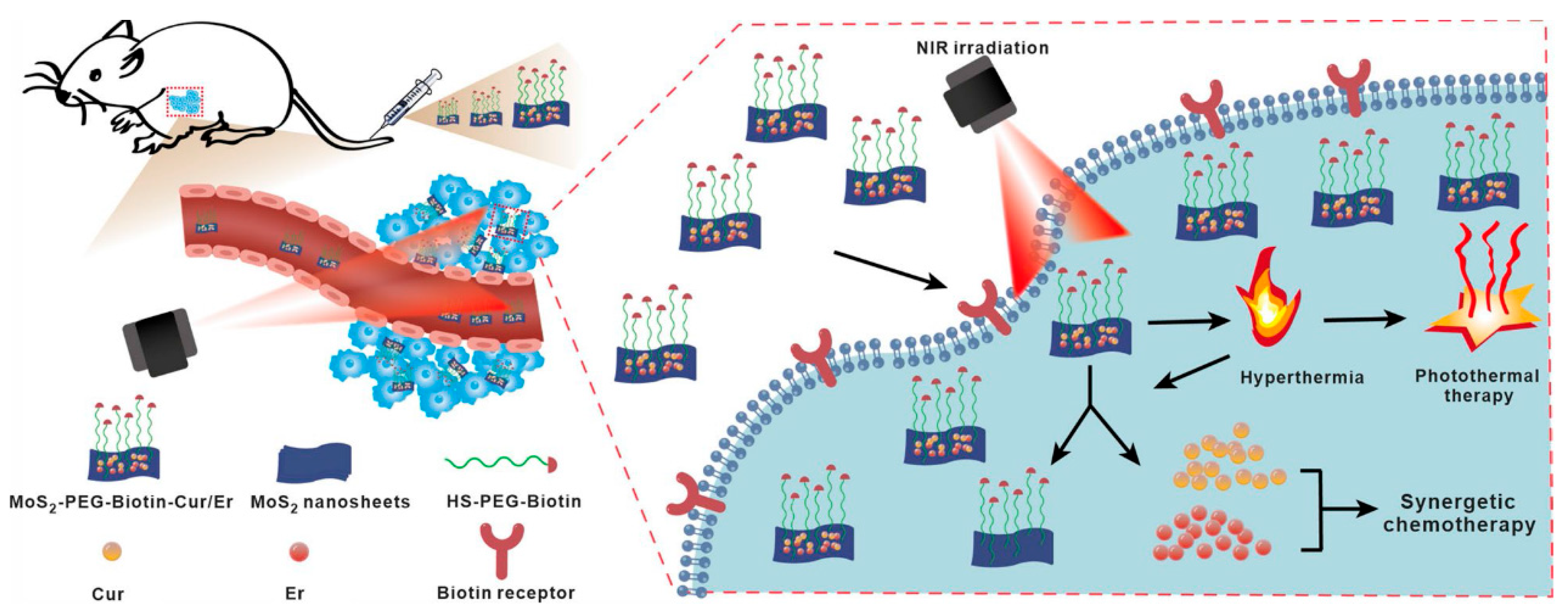 A schematic of MoS2-PEG-Biotin as a carrier demonstrates its capability for the targeted delivery of curcumin (Cur) and erlotinib (Er), facilitating the combination of synergistic chemotherapy and PTT. Reproduced from [15], Springer Nature, 2023.