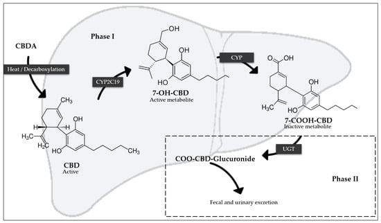 The two primary cannabinoids, CBD and THC, undergo extensive metabolism in the liver, primarily by cytochrome P450 isozymes CYP2C9, CYP2C19, and CYP3A4. In humans, these processes involve hydroxylation or oxidation, followed by glucuronidation catalyzed by UDP-glucuronosyltransferase (UGT) enzymes [,,].