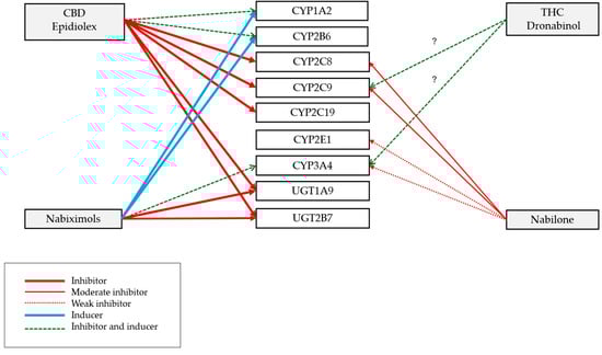 Nabiximols (Sativex®, THC: CBD; 1:1, equal quantities) can produce metabolic interactions, mainly mediated by its CBD component. Nabiximols was observed to be a reversible inhibitor of CYP3A4, CYP2C9, CYP2C19, CYP1A2, and CYP2B6 at concentrations significantly higher than those likely to be clinically achieved. In vitro research also demonstrated the potential of nabiximols for the time-dependent inhibition of CYP3A4 at clinically relevant concentrations. The inactivation rate of CYP3A4 is expected to be rapid. In an in vitro study, nabiximols inhibited the UGT enzymes, UGT1A9 and UGT2B7, at concentrations achievable in clinical settings []. Plasma concentrations of CBD and THC from clinical doses of nabiximols may be sufficient to induce CYP3A4, CYP2B6, and CYP1A2 at the mRNA level, potentially inducing drug-metabolizing enzymes and transporters in vitro; however, the clinical relevance of this induction remains unknown [].