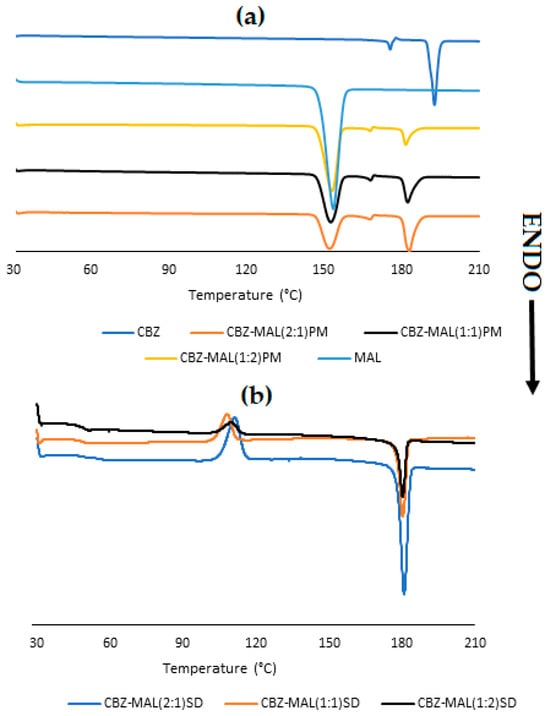 Overlay of DSC thermograms obtained for (a) MAL, CBZ, and CBZ-MAL PMs and (b) CBZ-MAL SDs.