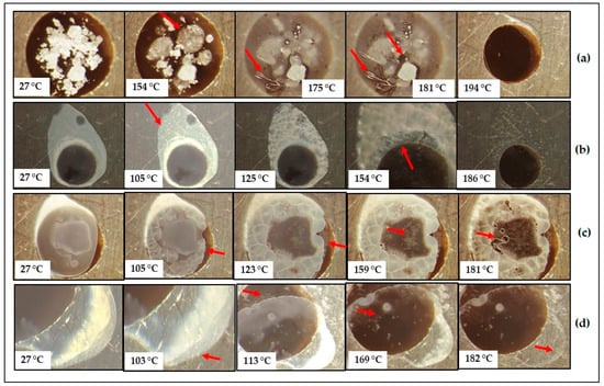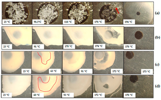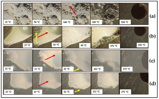 HSM micrographs obtained for the prepared (a) CBZ–MAL(1:1)PM, (b) CBZ–MAL(2:1)SD, (c) CBZ–MAL(1:1)SD, and (d) CBZ–MAL(1:2)SD during heating at 10 °C/min.