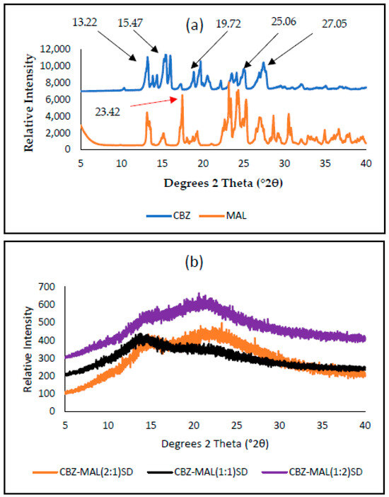 PXRD diffractograms obtained for pure CBZ, MAL (a) and the prepared SDs of CBZ–MAL in the molar ratios of 2:1, 1:1, and 1:2 (b).