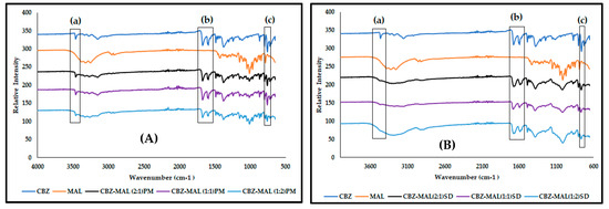 Rustichelli et al. [17] reported the FTIR bands characteristic of the known CBZ polymorphs. Form I is identified with the presence of bands at 3484, 1684, 1592, and 1393 cm−1; Form II with absorbance bands at 3473, 1673, 1591, and 1395 cm−1; and 3464, 1676, 1593, 1383, and 762 cm−1 for Form III. Form IV shows characteristic peaks at 3474, 1674, and 1394 with a small shoulder at 1418 cm−1 [15]. The FTIR spectrum of the CBZ obtained in this study (Figure 5) showed characteristic peaks at 3464 cm−1 (N–H stretching of the primary amine), 1674 cm−1 (C = O stretching), split peak at 1605 and 1593 cm−1 (C = C stretching and N–H deformation), 1378 cm−1 (C–H bending), and 760 cm−1 as the specific features of Form III [2,15,17,18]. The characteristic absorption peaks of MAL in the range of 3380–3257 cm−1 signify O-H stretching and C-H stretching functional groups. The FTIR spectra of the CBZ-MAL PMs (2:1 and 1:1) (Figure 5A) showed all the identified characteristic peaks of Form III, indicating no interaction between CBZ and MAL during the mere mixing of the two compounds. However, the CBZ-MAL(1:2)PM broadening in the wavenumber range of 3380–3257 cm−1 and reduced intensity of peaks 3464 cm−1 and 760 cm−1 indicate possible interaction with an increase in MAL concentration.
