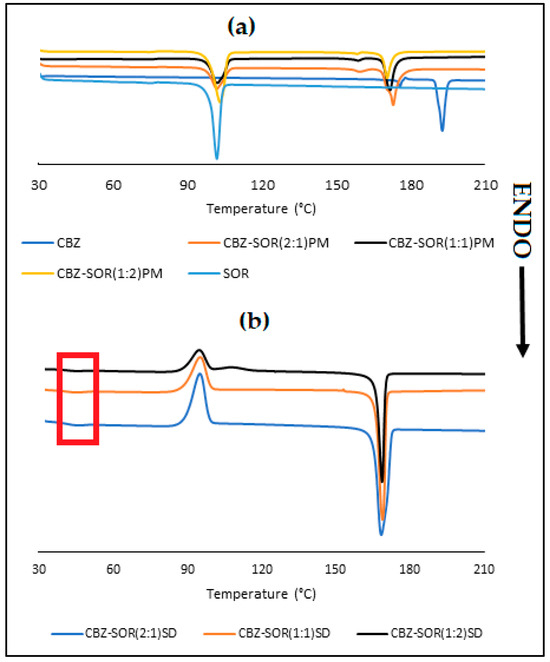 Overlay of DSC thermograms obtained for (a) SOR, CBZ, and CBZ-SOR PMs and (b) CBZ-SOR SDs.