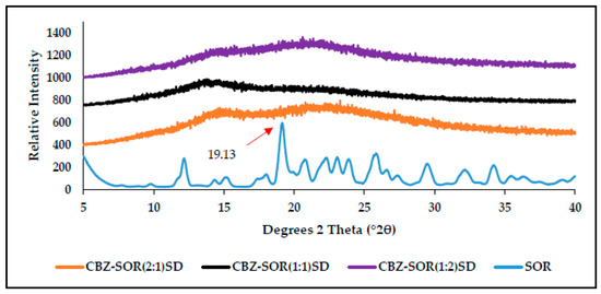 The PXRD spectra of the SOR (Figure 9) present with its characteristic peak at 2θ = 19.13 °2θ) [25] and several high-intensity diffraction peaks, signifying the crystalline nature. The PXRD pattern for the SD prepared with different molar ratios of SOR resembled a typical amorphous halo with several low-intensity peaks, highlighting a significant reduction in the particle size of both CBZ and SOR.