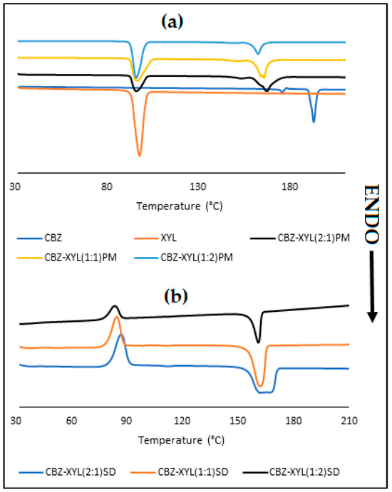 Overlay of DSC thermograms obtained for (a) XYL, CBZ, CBZ-XYL PMs and (b) CBZ-XYL SDs.