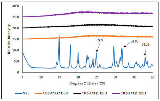 The PXRD spectra of XYL (Figure 13) present with its characteristic high-intensity diffraction peaks at °2θ = 24.294, 31.85, and 38.14 [30], signifying the crystalline nature. Unlike the PXRD patterns observed for the SDs of MAL and SOR (two halo humps observed), a single halo hump was observed for all the CBZ-XYL SDs. This observation can further support the argument of good miscibility between CBZ and XYL.