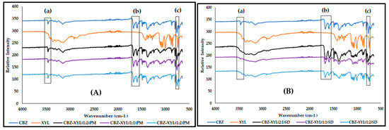 The FTIR spectrum of XYL (Figure 14) corresponds with the published literature, showing its characteristic broad peaks at 3100–3400 cm−1 for the –OH stretch, 1165 cm−1 for –C = O stretch, and 1050–1300 cm−1 for the carboxylic acid and alcohol groups moieties [2,31]. While the FTIR spectra for CBZ-XYL PMs retained all the characteristic peaks without any broadening or reduction intensity (Figure 14A), the FTIR spectra of all the CBZ-XYL SDs (Figure 14B) showed the characteristic peaks of CBZ Form III and XYL at a reduced peak intensity, indicating weak intermolecular interaction between CBZ and XYL.