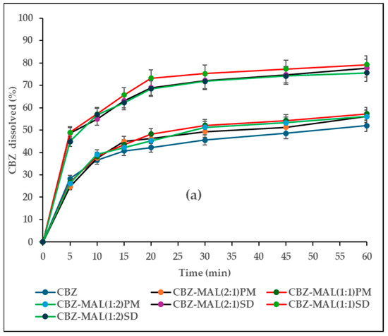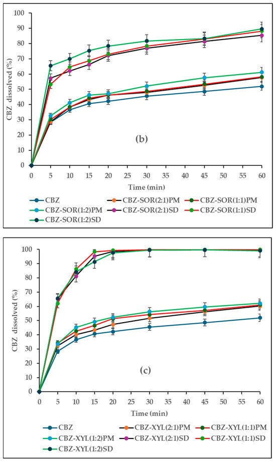 The CBZ release profiles from SDs prepared with MAL, SOR, and XYL are shown in Figure 15. From the graphs presented, the CBZ raw material showed incomplete dissolution with 52% within 60 min. The percentage drug release observed at 60 min for PMs of CBZ-MAL (Figure 15a), CBZ-SOR (Figure 15b), and CBZ-XYL (Figure 15c) indicated a slight increase in comparison with pure CBZ. The CBZ-XYL PMs showed slightly higher drug release than PMs of MAL and SOR. However, the differences seen among the PMs of various polyol combinations were found to be statistically insignificant (p = 0.68). In contrast to the PMs, all the SDs reported increased drug release (%), where all the SDs released more than 75% within 60 min. The drug release for SDs is in the order of CBZ-XYL (99.8% ± 0.44) > CBZ-SOR (87.8% ± 2.2) > CBZ-MAL (77.5% ± 1.8). These results correlate well with the solubility results reported for SDs. From the graph, it can be observed that the drug release is high for all the SDs across all the sampling points.