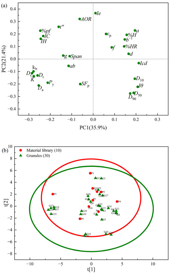The PCA of the physical properties data based on the first two principal components: (a) the loading plot; (b) the score plot (The red dots are 10 materials from the material library. The green positive triangles represent the granules).