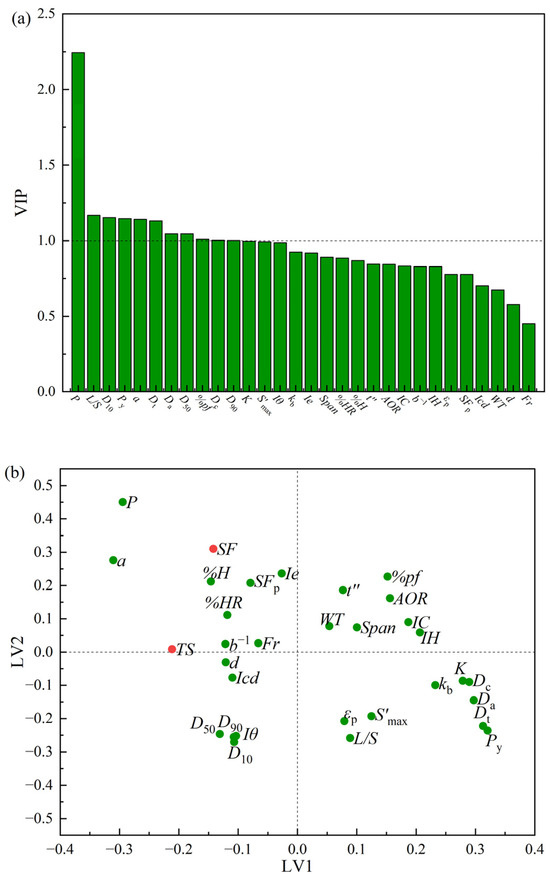 (a) The variable importance in the projection plot of PLS Model M2. (b) The loading plot of PLS Model M2.