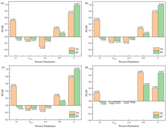 The sensitivity analysis of process parameters for typical materials. (a) The silicified microcrystalline cellulose (SMCC). (b) The cold-water-insoluble starch (CWIS). (c) The Bran-Processed Atractylodis Rhizoma (BPAR). (d) The Lactose Flowlac® 100 (Lac F100).