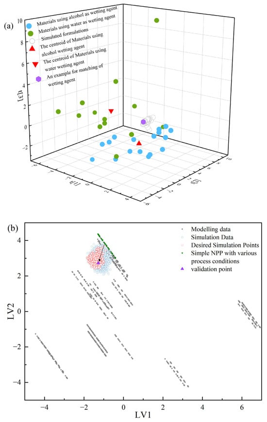 In Figure 5a, the blue dots represent the materials using alcohol as a wetting agent. The green dots represent the materials using deionized water as a wetting agent. The gray hollow dots represent the simulated formulations. The red positive triangle represents the centroid of the materials using an alcohol wetting agent. The red inverted triangle represents the centroid of the materials using a water wetting agent. The purple hexagon is an example formulation. In Figure 5b, the gray dots represent the data points used for building the model. The blue hollow dots represent the simulated combinations of the formulation and process conditions. The red hollow squares represent the desired simulation points that meet the objectives specified in Step 4 of FPPID. The green inverted triangles represent a single NPP material under different process conditions. The purple positive triangle represents the selected validation point.