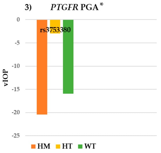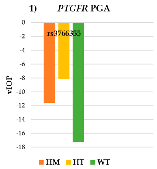 Concerning the SNP rs3753380 in the PTGFR gene, statistically significant differences in terms of vIOP were detected among the PGA group: WT = −15.94 ± 22.10 mmHg and HT = −2.99 ± 25.23 mmHg with p = 0.032 (Figure 3). The results for the VF parameters were not remarkable in this group (Table 4).