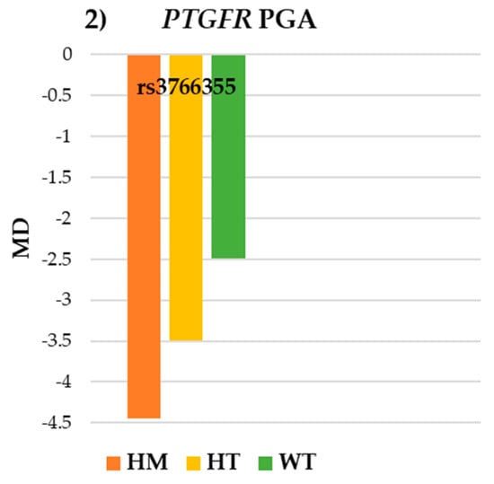 Regarding the SNP rs3766355 of the PTGFR gene, no statistically significant differences in IOP and VF parameters were observed (Table 3). However, the trends were consistent in both: higher vIOP was found in WT (−17.23 ± 16.44 mmHg) compared to HT −8.10 ± 24.80 mmHg) and HM (−11.64 ± 24.43 mmHg) and better values of MD were found in WT (−2.49 ± 1.91 dB) in contrast to HT (−3.49 ± 6.13 dB) and HM (−4.45 ± 5.99 dB) in the PGA group (Figure 1 and Figure 2).