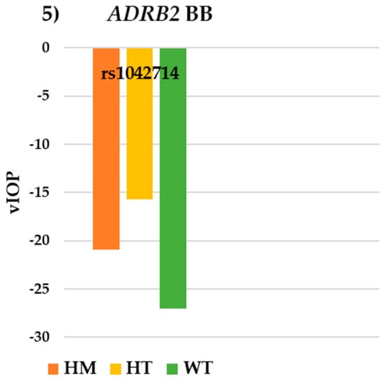 For the ADRB2 gene BB group, no statistically significant differences in the VF or IOP parameters were observed (Table 5). However, a trend was noted: WT (−1.13 ± 1.53 dB) exhibited better MD values than HM (−5.35 ± 9.92 dB) and HT (−6.93 ± 6.78 dB), p = 0.064 (Figure 4). Additionally, higher vIOP was observed in WT (−27.00 ± 15.89 mmHg) and HM (−20.93 ± 21.09) compared to HT (−15.70 ± 24.52 mmHg) in this group (Figure 5).
