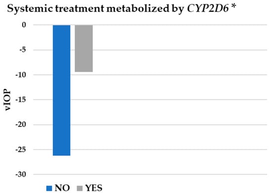 Influence of systemic treatment metabolized by CYP2D6 on intraocular pressure. CYP2D6: cytochrome P450 2D6; vIOP: rate of intraocular pressure variation. * p < 0.05 (indicating statistical significance).