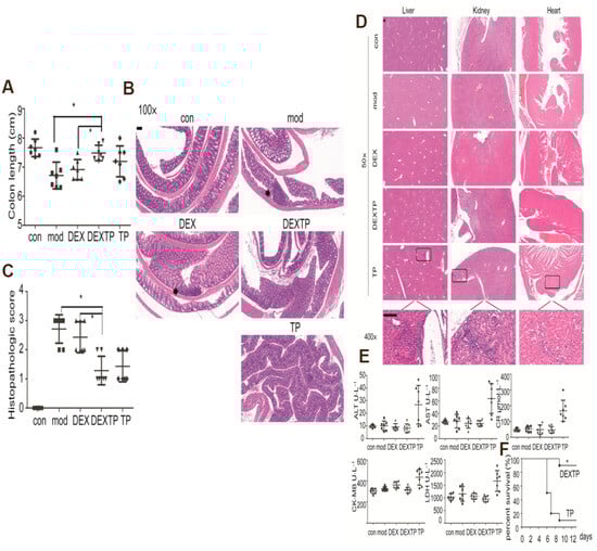 (A) Colon length of mice in each group (* p < 0.05). (B) H&E staining showed that DC-EXOTP (DEXTP) reduced mucosal damage and inflammatory cell infiltration in the colon (the scale bar represents 100 μm). Arrowheads point to a microabscess and inflammatory cell infiltration. (C) Histological colitis score of mice in each group (two-tailed t test, * p < 0.05). (D) H&E staining of liver, kidney, and heart tissues from each group. Enlarged view showed pathological damage to organs in the TP group. No obvious injury was observed in DEXTP and other groups (the scale bar represents 100 μm). (E) Serum biochemical indicators including ALT, AST, Cr, CK-MB, and LDH were detected and showed liver, kidney, and heart injury in some of the mice in the TP group. There is no significant difference among the other groups. (F) Survival time of mice from increased dose groups were recorded (n = 10, * p < 0.05) [27].